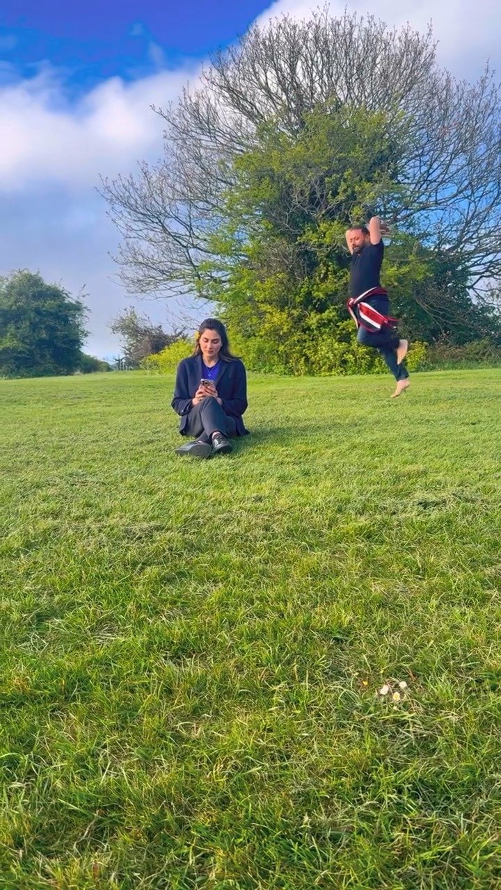 Fiza Ali shares new romantic videos from the United Kingdom featuring her husband Ejaz Khan performing playful backflips, sparking both amusement and debate on social media.