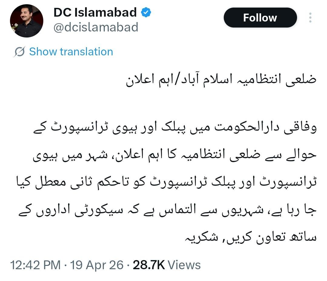 Public and heavy transport services have been suspended in Islamabad until further notice as authorities cite security concerns and urge citizens to cooperate with law enforcement agencies.