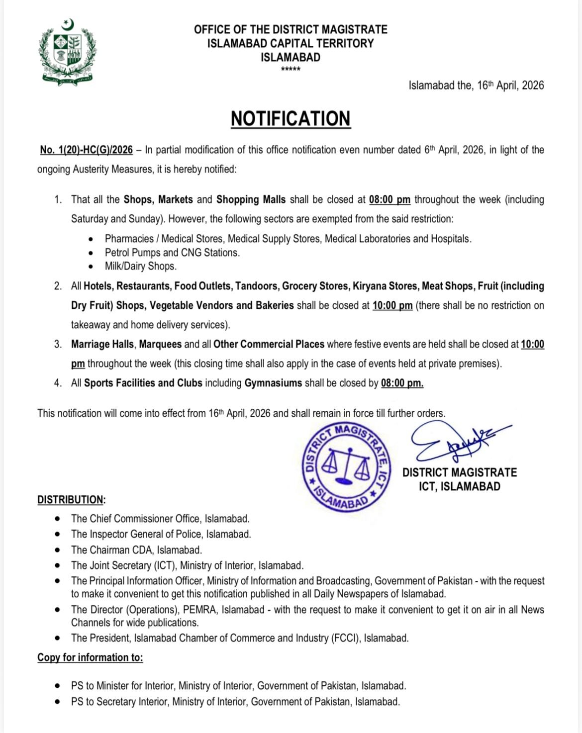 Islamabad: The Office of the District Magistrate in Islamabad has issued a new notification enforcing early closing hours for businesses across the capital, effective April 16, 2026, as part of ongoing austerity measures.