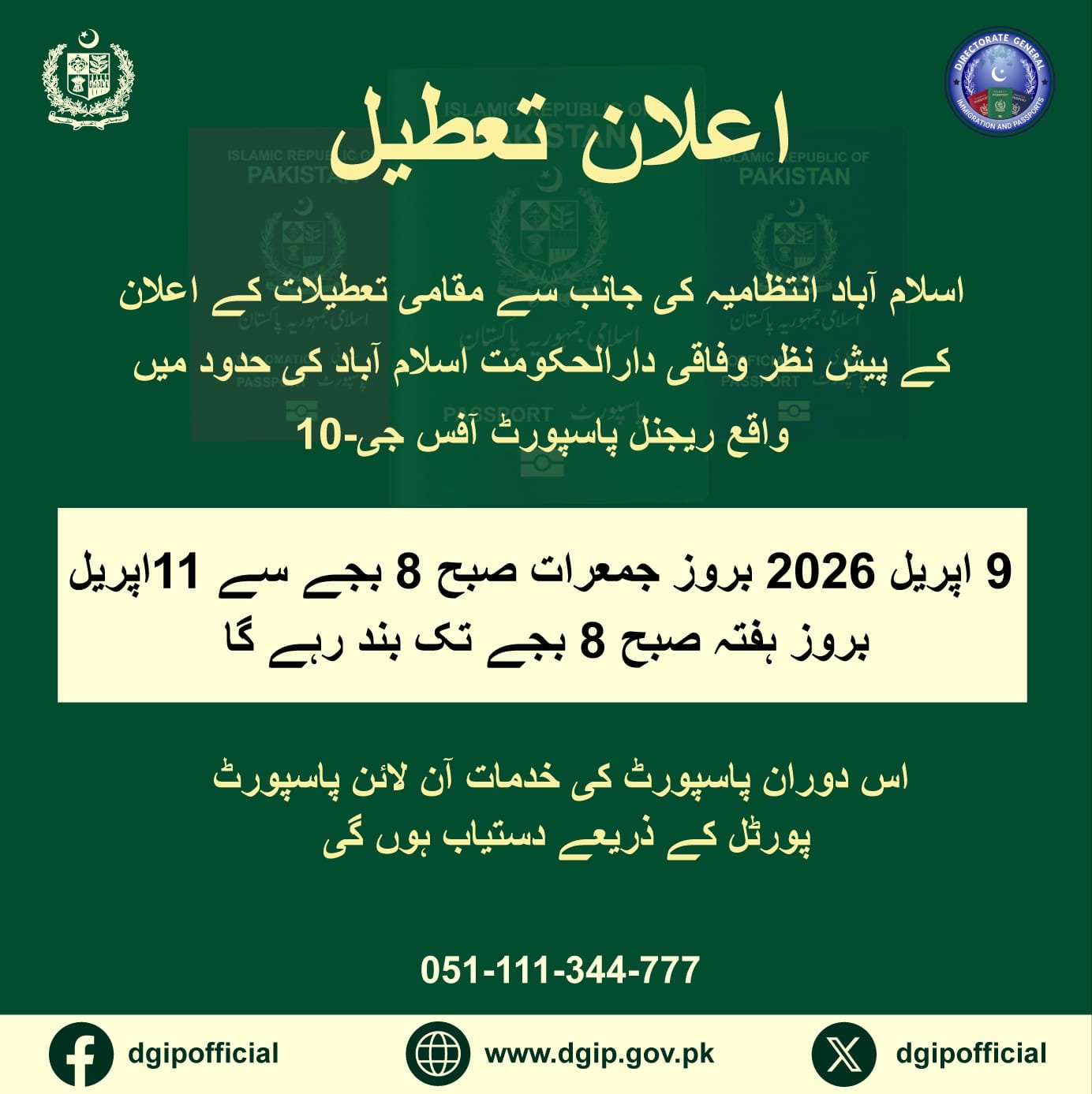 According to the official notice, the passport office located within the jurisdiction of the Islamabad administration will remain closed from 8:00 a.m. on Friday, April 9, until 8:00 a.m. on Monday, April 11. The closure affects all in-person services at the Regional Passport Office.