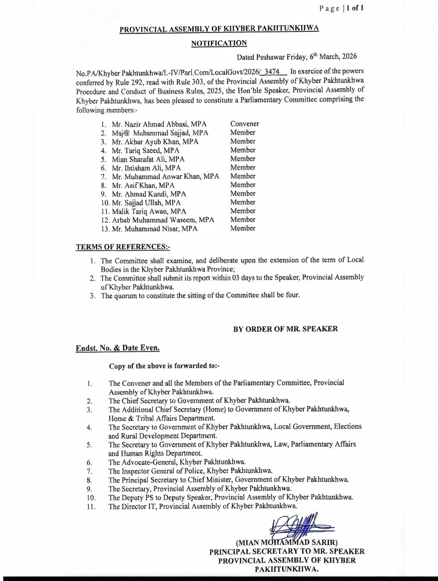 According to an official notification, Member of Provincial Assembly Nazeer Ahmad Abbasi will serve as the committee’s convener. Other members include Muhammad Sajjad, Akbar Ayub Khan, Tariq Saeed, Mian Sharafat Ali, Ihtesham Ali, Muhammad Anwar Khan, Asif Khan, Ahmad Kundi, Sajjadullah, Malik Tariq Awan, Arbab Muhammad Waseem and Muhammad Nisar.