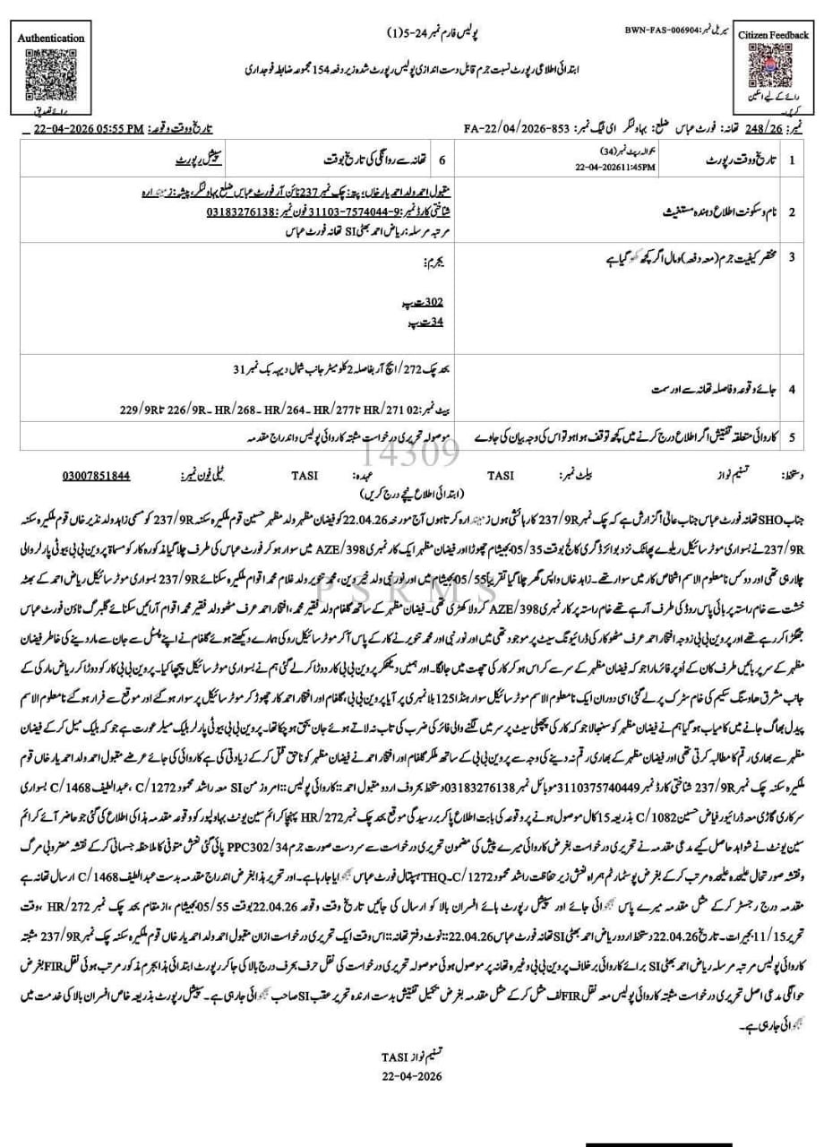 According to police officials, the victim was identified as Muhammad Faizan Mazhar, a resident of Chak 237 HR. Initial findings indicate that he was killed by a gunshot wound to the head.
