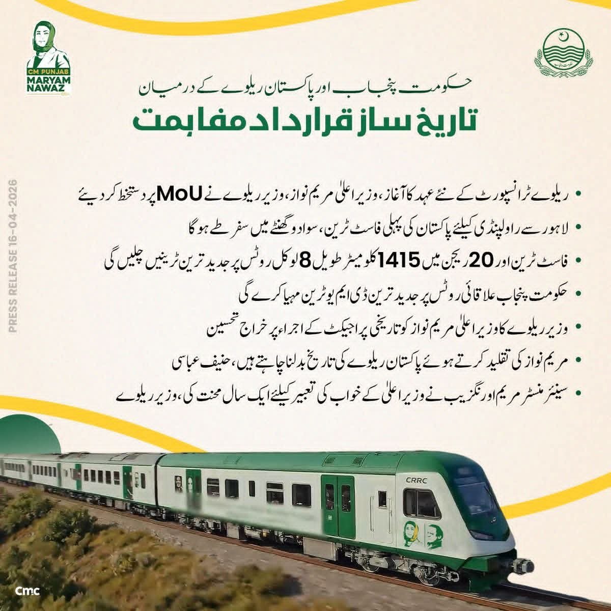 Chief Minister Maryam Nawaz oversaw the agreement, marking a significant step toward upgrading Pakistan’s rail infrastructure. The initiative includes the development of eight new railway routes covering approximately 1,415 kilometers, making it one of the largest rail expansion plans in recent years.