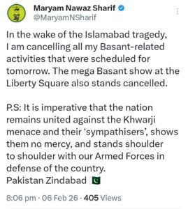 In a statement posted on the social media platform X, Nawaz announced that the planned Basant event at Lahore’s Liberty Square would not proceed in light of the attack. She stressed the need for national unity against terrorism, urging citizens to stand alongside security forces.