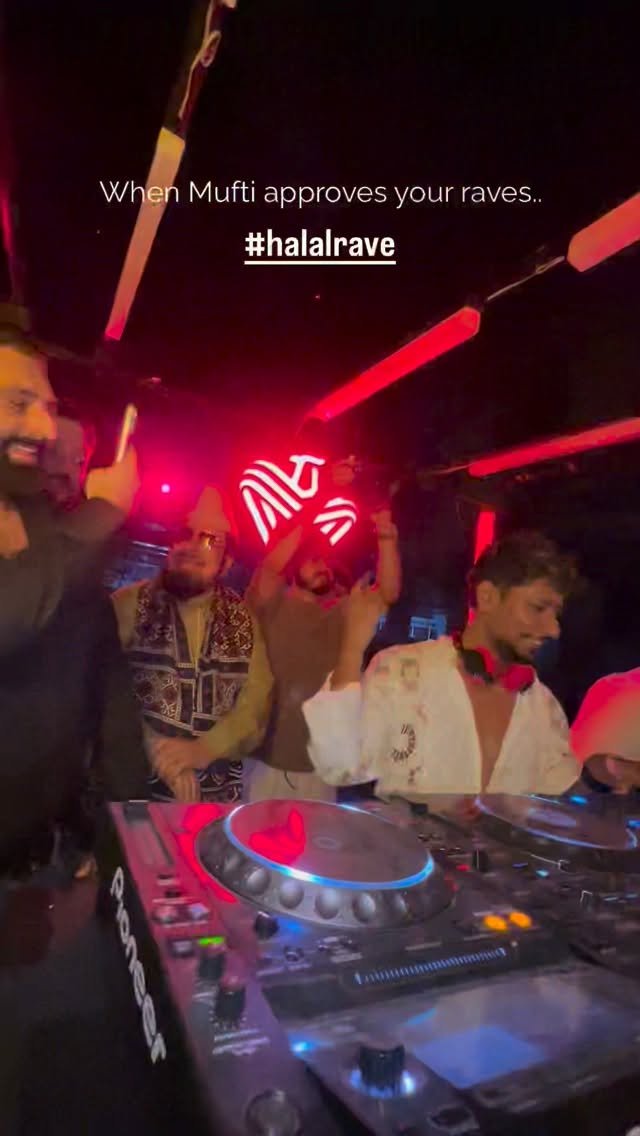 The footage shows Mufti Abdul Qavi present in his usual attire inside an environment filled with loud electronic music, a DJ performance, and a crowd engaged in dancing and recording the moment on their mobile phones. The setting appears consistent with a modern rave gathering, a type of music event characterized by high-energy sound, flashing lights, and continuous DJ sets.