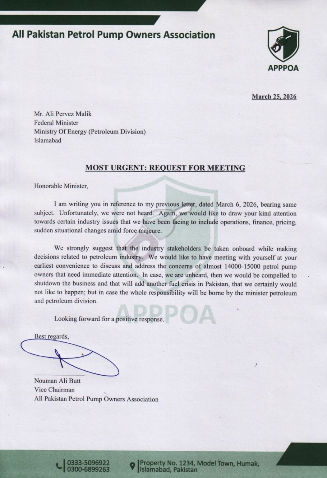 In an official statement, the association said it had sent a fresh letter to Federal Minister for Petroleum Ali Pervaiz Malik, requesting an urgent meeting. The letter follows an earlier communication sent on March 6, which reportedly received no response.