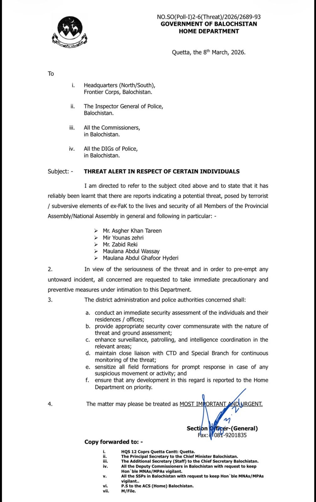 The alert specifically named several senior leaders, including Maulana Abdul Ghafoor Haideri, Maulana Abdul Wasey, Mir Younas Aziz Zehri, Zabid Reki, and Asghar Khan Tareen.